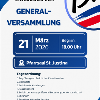 Die diesjährige Generalversammlung findet am Samstag, 21.03.2026 im Pfarrsaal St. Justina statt. Die Einladung mit Tagesordnung finden Sie hier.